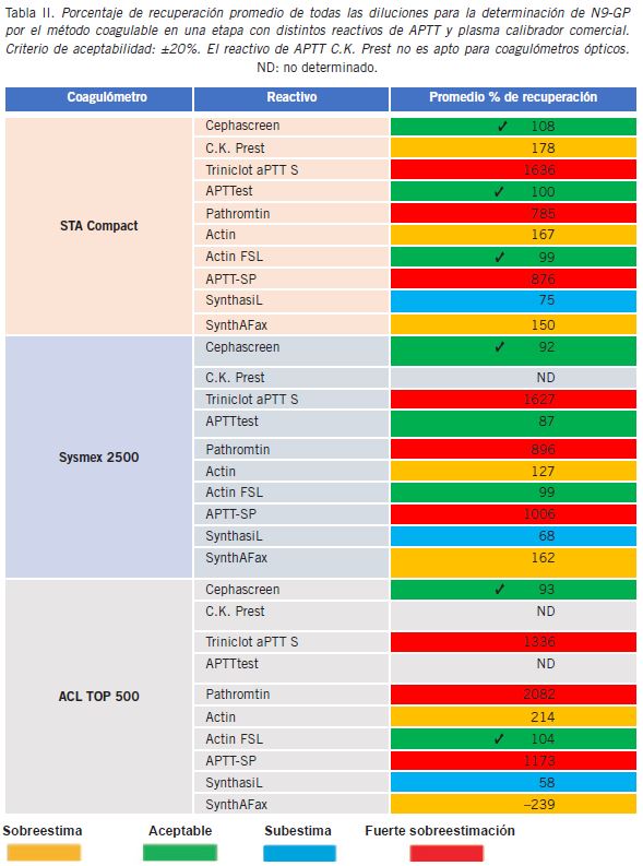La utilización de ensayos con calibradores específicos de N9-GP podría ser de utilidad para una mejor recuperación, independiente del reactivo de APTT; sin embargo, las guías internacionales no lo recomiendan porque a veces es difícil que el laboratorio acceda al producto y por falta de estandarización (10) (11) (12) (13) (14) (15) (16) (17) (18) (19) (20) (21) (22).