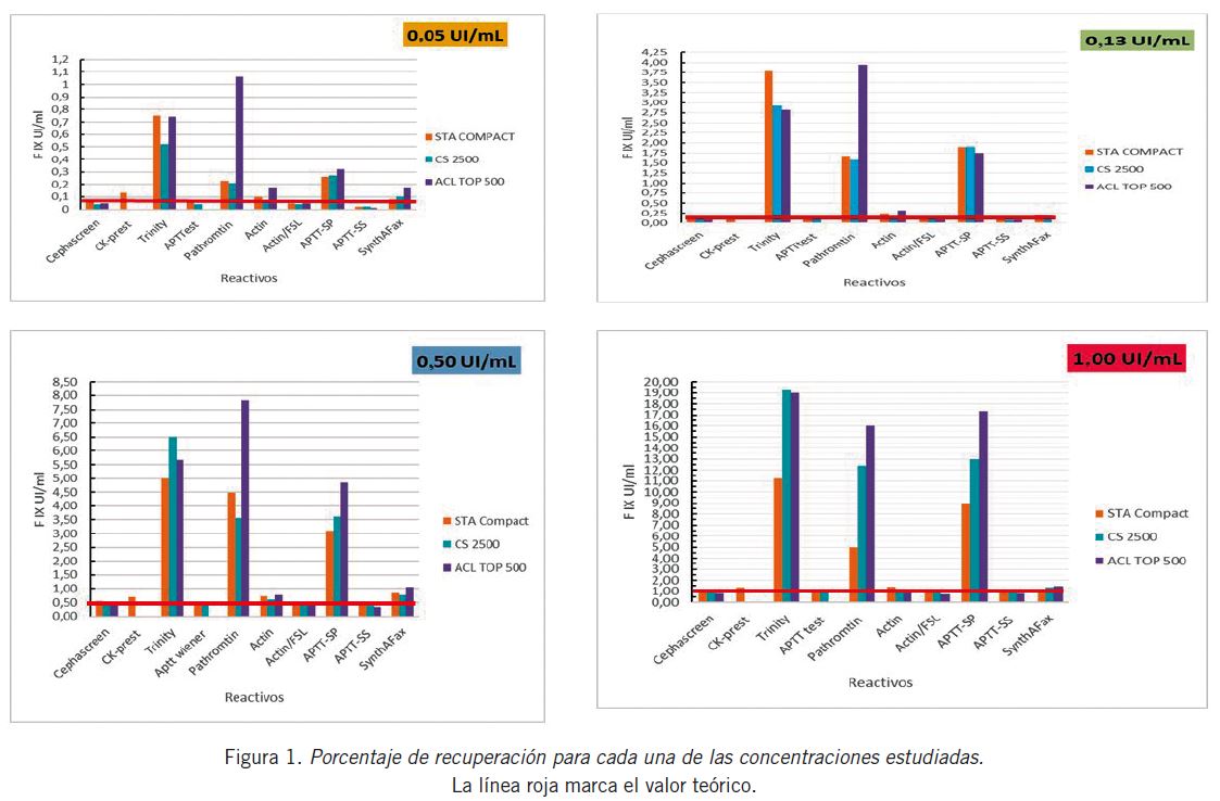 Por otro lado, los tres reactivos que contenían sílica como activador sobreestimaron los valores de recuperación, a excepción de APTT SynthasIL que los subestimó recuperando sólo entre un 50 y un 70% de acuerdo con lo observado por otros autores (11) (12) (13) (14) (15) (16).