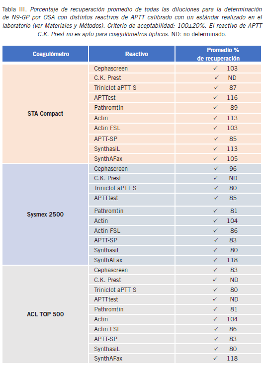 En la práctica clínica cada plataforma realiza los OSA con reactivos de APTT, calibradores y plasmas deficientes inmunodepletados del mismo fabricante. En este trabajo se ha probado cada reactivo de APTT en tres coagulómetros con calibradores y plasmas deficientes, específicos del coagulómetro y no del fabricante del reactivo de APTT; no obstante ello, el comportamiento de recuperación esperable, sobre o subestimación, se evidenció de manera similar.