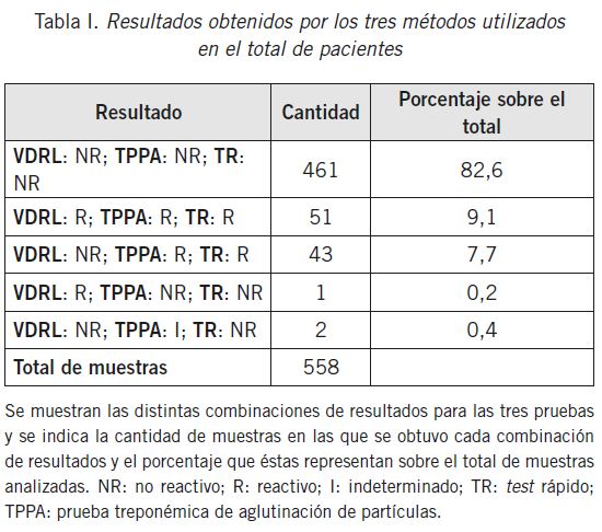 De las 558 muestras procesadas, en 51 de ellas (9,1%) se obtuvieron resultados positivos para VDRL y para ambas pruebas treponémicas, indicando infección activa en estos pacientes.