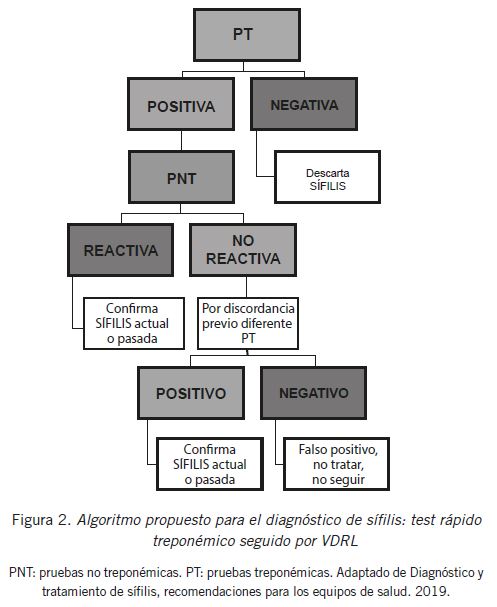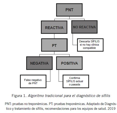PNT: pruebas no treponémicas. PT: pruebas treponémicas. Adaptado de Diagnóstico y tratamiento de sífilis, recomendaciones para los equipos de salud. 2019