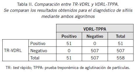 En el presente estudio, tras la comparación del algoritmo tradicional para diagnóstico de sífilis (VDRL-USR seguido por TPPA) con el algoritmo reverso (test rápido treponémico Alere Determine TP seguido por VDRL-USR) se obtuvo un porcentaje de concordancia global de 100%, lo que indica que ambos poseen un desempeño diagnóstico comparable en la población estudiada.