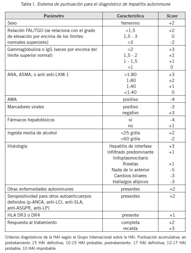 No existe una prueba diagnóstica única para la HAI y su diagnóstico se basa en características clínicas, serológicas, bioquímicas y en hallazgos histológicos, junto a una exclusión cuidadosa de otras causas de enfermedad hepática crónica. En 1993 el GIHA codificó los criterios diagnósticos para la HAI y se creó un sistema de puntuación diagnóstica, revisada en 1999 (2) (7).