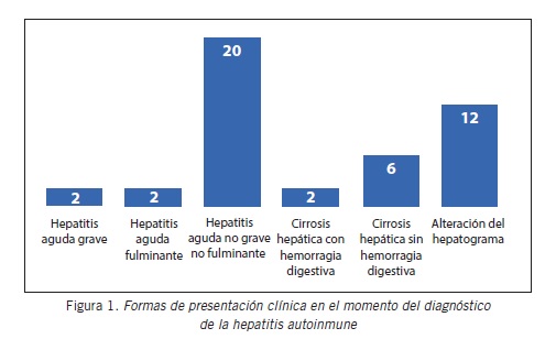 De los pacientes que se presentaban como hepatitis aguda, 14 tenían una elevación de enzimas hepáticas (GOT y GPT) por encima de 20 veces el valor normal de referencia; de ellos, 8 tenían valores entre 20 y 40 y en 6, el aumento fue de 40 veces, mientras que en aquellos que se manifestaban con una alteración del hepatograma, la elevación fue menor de 15 veces. La menor elevación enzimática se observó en los pacientes en los que se diagnosticó HAI en el contexto del hallazgo de cirrosis hepática. Una paciente presentó valores de fosfatasa alcalina aumentada por encima de 9 veces respecto del valor normal; sin embargo, la biopsia mostró características de HAI sin lesión de los conductos biliares.