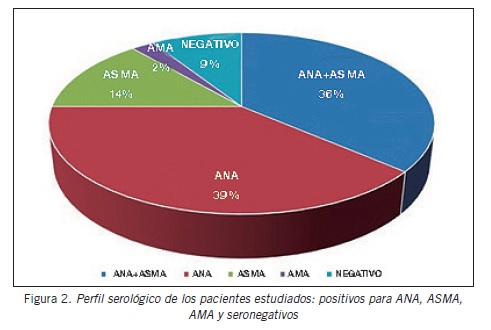 Según los resultados de laboratorio, 40 pacientes (90,9%) tenían autoanticuerpos; el título más preponderante fue de 1/160 en ANA y de 1/80 en ASMA. Cuatro resultaron seronegativos (Fig. 2).