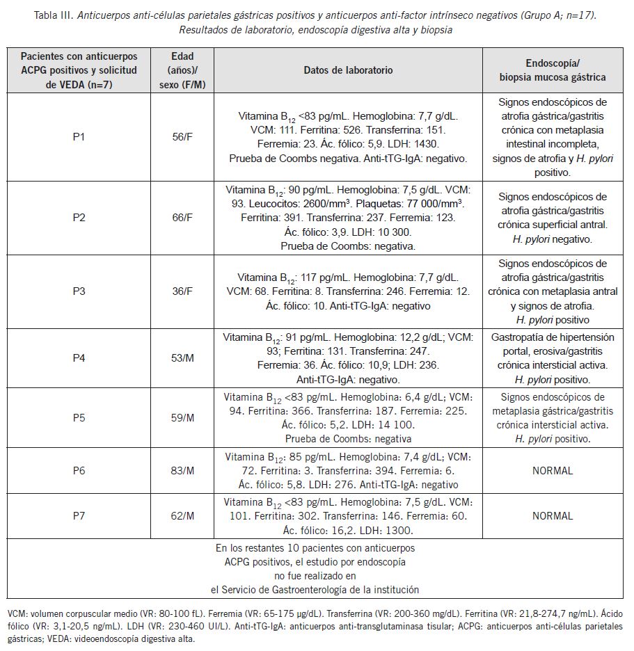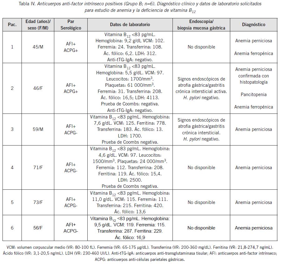 Entre los pacientes con anticuerpos AFI positivos (Grupo B, n=6), en 2 de ellos se realizó el diagnóstico de anemia perniciosa confirmada con estudios de endoscopía e histopatología. En los otros 4 pacientes estos estudios no fueron realizados en el Servicio de Gastroenterología de la institución (Tabla IV). Se encontró que los diagnósticos de AP correspondieron al 0,3% del total de los pacientes estudiados con el ensayo de vitamina B12 total. Entre los hallazgos de laboratorio, se observó: anemia en los 6 pacientes, macrocitosis en 4, ADH en 2, leucopenia y plaquetopenia en 1 y valores de LDH entre 3 y 8 veces el valor de referencia en 3 de ellos. La determinación de vitamina B12 fue <83 pg/mL en todas las muestras.