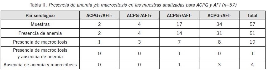 Se encontró una prevalencia del 13,1% para la deficiencia de vitamina B12 en la población estudiada. De las 2050 muestras analizadas con el ensayo de vitamina B12 total, 268 tuvieron valores menores de 200 pg/mL. A su vez, 51 (2,5%) de 268 muestras no fueron cuantificables por el método usado (<83 pg/mL). En 513 muestras el valor medido estuvo en el rango 200-300 pg/mL, es decir, el 25% de los pacientes tuvieron niveles bajos de B12. En 55 de las 57 muestras analizadas para anticuerpos ACPG y AFI, el resultado de B12 fue <200 pg/mL y a su vez, 24 muestras tuvieron valores de B12 <83 pg/mL (Tabla I). La anemia estuvo presente en 51/57 (89,5%) pacientes y se observó macrocitosis en 19/57 (33,3%) (Tabla II). La positividad sérica para anticuerpos ACPG y/o AFI se agrupó de la siguiente manera; Grupo A: 17 sueros simple positivos para ACPG; Grupo B: 4 sueros simple positivos para AFI y 2 sueros doble positivos para ACPG/AFI. En los pacientes que solo tuvieron anticuerpos ACPG positivos (Grupo A, n=17), el estudio de VEDA fue realizado en 7 y se tomaron muestras para anatomía patológica en 5 de ellos (Tabla III). En los restantes 10 pacientes el estudio por endoscopía no fue realizado en el Servicio de Gastroenterología de la institución. En los 5 pacientes estudiados por anatomía patológica (P1 a P5, Tabla III), se realizó el diagnóstico de gastritis crónica y en 4 de ellos se detectó la presencia de H. pylori. En los pacientes estudiados por endoscopía, entre los hallazgos de laboratorio se encontró: presencia de anemia en los 7 pacientes, macrocitosis en 2, anemia por deficiencia de hierro (ADH) en 6, leucopenia y plaquetopenia en 1 y valores de LDH entre 6 y 60 veces el valor de referencia en 4 de ellos. Las medidas de vitamina B12 estuvieron en el rango: <83-117 pg/mL.