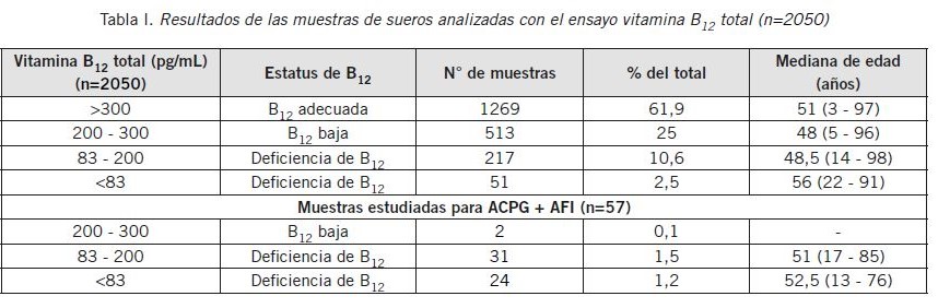 Se realizó un estudio descriptivo, retrospectivo y transversal sobre un total de 2050 muestras de pacientes con solicitud de vitamina B12 total, procesadas por el Servicio de Laboratorio del Hospital San Roque de Gonnet, ciudad de La Plata, Argentina, durante el período octubre 2021-agosto 2023. Como criterio de inclusión se utilizó el pedido de vitamina B12 total. Del total de muestras analizadas, 1040 correspondieron a pacientes internados y 1010 a pacientes ambulatorios atendidos por consultorios externos. Se incluyó un total de 1382 mujeres y 668 hombres con una mediana de edad de 50 años (rango etario: 3-98 años). Se procesaron 57 muestras para las determinaciones de anticuerpos ACPG y AFI según solicitud médica (32 mujeres, 25 hombres, mediana: 52,5 años). Para estas pruebas se utilizó como criterio de inclusión la presencia de valores bajos o deficientes con el ensayo de vitamina B12 total y el criterio de exclusión fue presentar valores de B12 total adecuada.