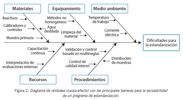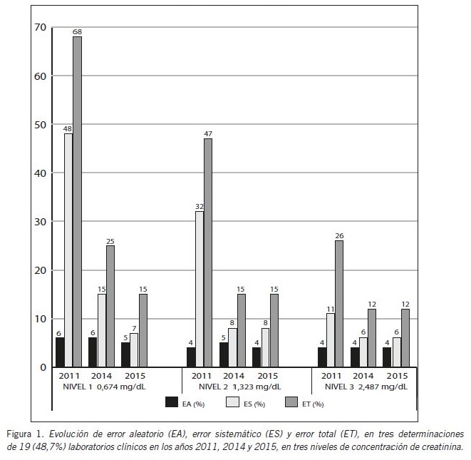 Resumen: Los programas de estandarización de creatinina mantienen su vigencia. El objetivo es describir la experiencia adquirida durante el desarrollo de un programa de estandarización de creatinina en una provincia de bajos recursos y mostrar los aspectos que se deben considerar para su escalabilidad en un contexto semejante. El programa se desarrolló en etapas: en la primera (2010) se realizó el relevamiento de 49 laboratorios clínicos (LC) distribuidos en toda la provincia del Chaco, Argentina. En la segunda (2012) se ajustó el error aleatorio (EA) aplicando protocolos internacionales (CLSI EP-5A). En la tercera etapa (2014-2015) se procesaron paneles de sueros con concentraciones asignadas por un método trazable al de referencia y al estándar internacional (CG-IDMS). Se aplicaron protocolos internacionales para evaluar el error total (ET) de la determinación en cada laboratorio (CLSI EP-10A). En 2016, aplicando herramientas de calidad, se evaluaron las barreras en el proceso. Se observó en el EA: para un nivel de 1,00 mg/dL, ningún LC alcanzó los niveles deseables; para un nivel de 2,5 mg/dL solo 9 (23%) los alcanzaron. Concluida la segunda y tercera etapa, solo 18 laboratorios (48,7%) lograron ajustar el EA y/o ET, pero resultó dificultoso sostenerlo en el tiempo. Los reactivos, calibradores y controles son producidos por la industria y depende del estado el control de los mismos. La homogeneidad del equipamiento depende de la accesibilidad económica y del volumen de trabajo. El medio ambiente, la temperatura y la calidad del agua siguen siendo una dificultad para la escalabilidad.