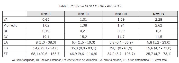 En la evaluación preliminar, no solo se observaron diferencias importantes en los valores promedio de cada nivel con el valor de referencia, sino también se observaron variaciones (CV%) con valores extremos de 30-40%, lo que determinó errores totales muy altos (Tabla I).