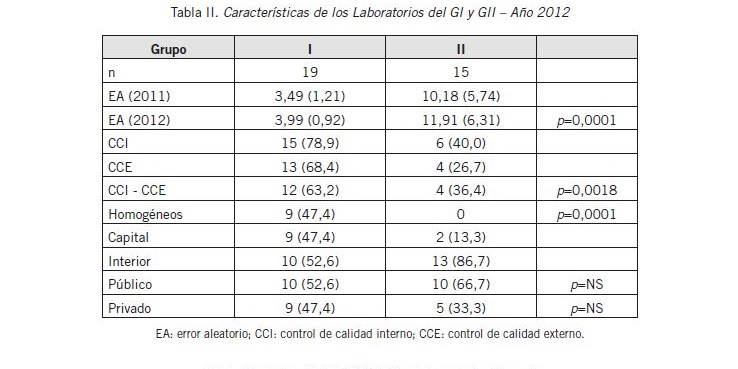 Se conformaron entonces dos grupos de LC: el Grupo I (GI) estaba constituido por 19 (48,7%) laboratorios que habían ajustado el EA y el Grupo II (GII) por 16 (41,0%) que mantuvieron valores elevados de EA (≥4,0). Se encontraron diferencias significativas en la implementación de CCI y CCE: 12 (63,2%) en el GI y 4 (36,4%) en el GII (p=0,0001). No se hallaron diferencias significativas entre laboratorios públicos y privados (Tabla II).