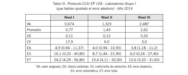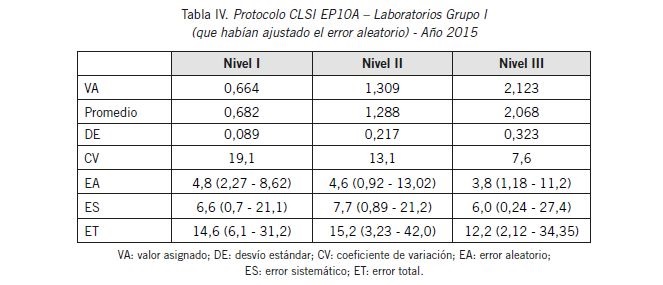 En la tercera etapa (2014-2015) se procesaron paneles de sueros con concentraciones asignadas por un método trazable al de referencia y al estándar internacional (CG-IDMS). Se aplicaron protocolos internacionales para evaluar el error total de la determinación en cada laboratorio (CLSI EP-10A).