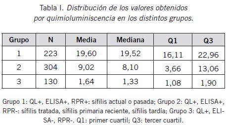 sífilis confirmada fue 0,27% (IC95%=0,23-0,31). La distribución de los valores de S/CO obtenidos por QL en los distintos grupos se muestra en la Tabla I.