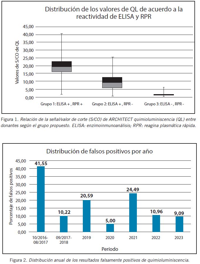 Las muestras reactivas, tanto por los dos métodos treponémicos así como por el método no treponémico, que corresponderían a donantes con infección actual o pasada, mostraron valores medios de S/CO por QL más altos (S/CO media=19,60; DE=6,59) con respecto a los valores de las muestras reactivas solo por QL y ELISA y negativas por RPR (S/CO media=9,02; DE=5,89), es decir, las que podrían deberse a sífilis tratada, primaria muy reciente y activa, o sífilis tardía.