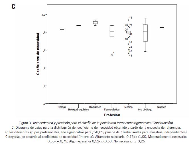 En la Figura 3C se muestra el diagrama de cajas para el análisis del coeficiente de necesidad, de acuerdo a los grupos profesionales. En el grupo de los médicos se aprecia una mayor variabilidad en cuanto al acceso y disponibilidad de la información o conocimientos deltema; los microbiólogos y los farmacéuticos les siguieron en orden. Los bioquímicos proyectaron un mayor coeficiente y la distribución fue homogénea. No obstante, estadísticamente no se mostraron diferencias entre grupos, analizados a través de la prueba de Kruskal-Wallis para comparación de medias de muestras independientes (p=0,066; n=46) y un nivel de significación de 0,05.