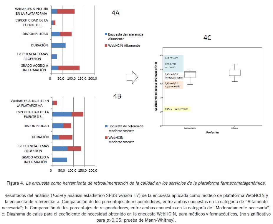Teniendo en cuenta la valoración obtenida de la encuesta WebHCIN, los autores proponen considerar que si más del 50% de los accesos registrados en la encuesta, en determinado período de tiempo, se comportan con un coeficiente de necesidad de acceso entre: 0,75<x<1,00 (categoría “Altamente necesario”) y 0,65<x<0,75 (categoría “Moderadamente necesario”), podría considerarse que la plataforma farmacometagenómica creada tiene una utilidad satisfactoria y que puede continuar generando nuevas propuestas de variables a incluir como elementos de novedad.