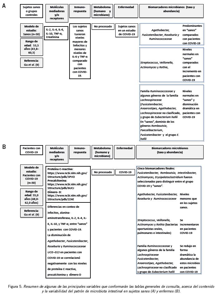 Con la ilustración de las dos primeras columnas (1 y 2) en las Figuras 5A y 5B, se tiene previsto obtener ventajas en el tipo de organización de la información, de una manera inclusiva, resumida y asequible al personal médico, que le permitirá valorar las diferencias entre los principales patrones taxonómicos bacterianos y homeostáticos característicos del estado “sano” o “saludable” de referencia. El modelo que se propone con la ayuda de tablas o “pestañas informáticas” para la plataforma, se ejemplifica a partir de un estudio realizado por Gu et al. (9), en un grupo control de sujetos sanos y un grupo de pacientes diagnosticados de COVID-19.