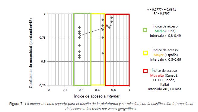 Los sujetos encuestados procedían de diversos países, con diferencias en cuanto a la tasa de profesionales disponibles por densidad de población: España (con una tasa de 4 médicos facultativos por cada 1000 habitantes), Cuba (tasa 8,4/1000 habitantes), Italia (8/1000habitantes), Estados Unidos (2,6/1000 habitantes) y Canadá (2,4/1000 habitantes) (19) y diferencias encuanto al parámetro “Nivel de acceso a internet y desarrollo de las TIC”.