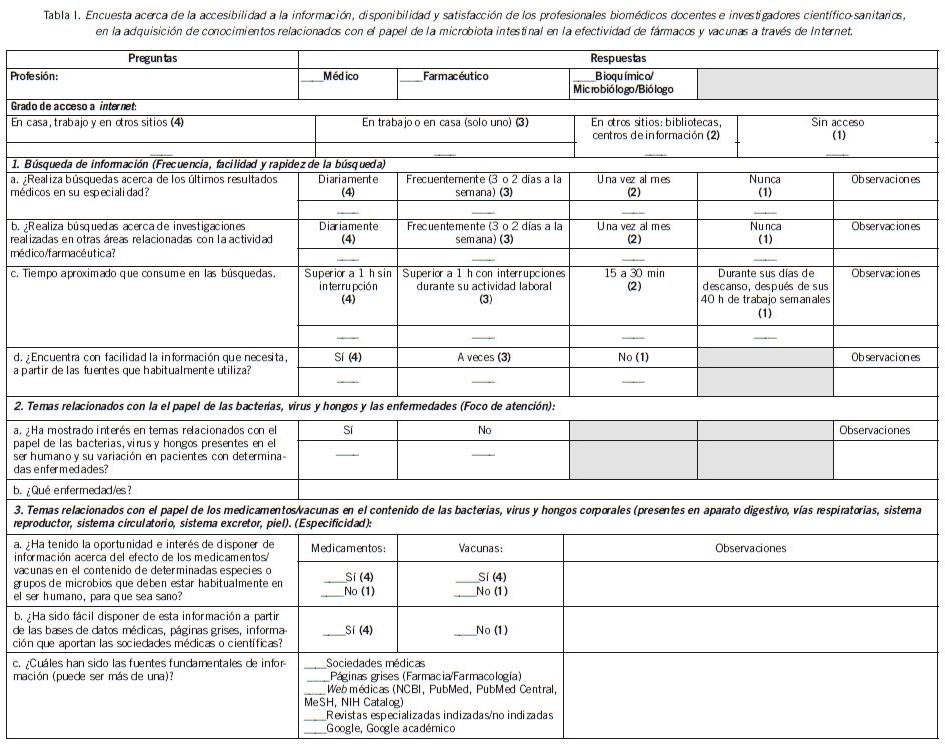 La encuesta incluyó solicitud de información acerca de qué facilidades disponen los profesionales para realizar sus consultas por internet, la frecuencia con la que lo hacen, las plataformas más conocidas y el conocimiento básico del profesional acerca del papel de los microbios intestinales en los mecanismos que garantizan la efectividad de un medicamento o una vacuna.