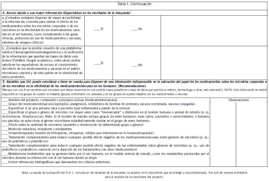 Con el propósito de proporcionar un escenario completo de los antecedentes para el diseño de la plataforma farmacogenómica e incrementar la eficiencia en las búsquedas (en cuanto a calidad y reducción del tiempo de búsqueda), se diseñó la encuesta destinada a profesionales biomédicos, investigadores científicos y docentes (Tabla I).