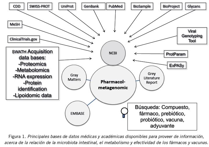 Existe una gran riqueza de bases de datos y plataformas informáticas disponibles que aportan evidencias sobre el microbioma y el metaboloma como biomarcadores. Las principales bases de datos académicas y médicas (NCBI, PubMed, PubMed central, Cochrane library, EMBASE, UpToDate) brindan una amplia información (contenida en revisiones, ensayos clínicos, metaanálisis e investigaciones originales) acerca de la cantidad y variedad de géneros bacterianos, grupos de virus, hongos, localización de tejidos y órganos, como resultado de estudios genómicos, metagenómicos, metabolómicos, proteómicos y farmacológicos humanos, lo que confirma que es necesario ofrecer una plataforma para su disponibilidad para médicos, farmacólogos, microbiólogos, químicos y bioquímicos (18).