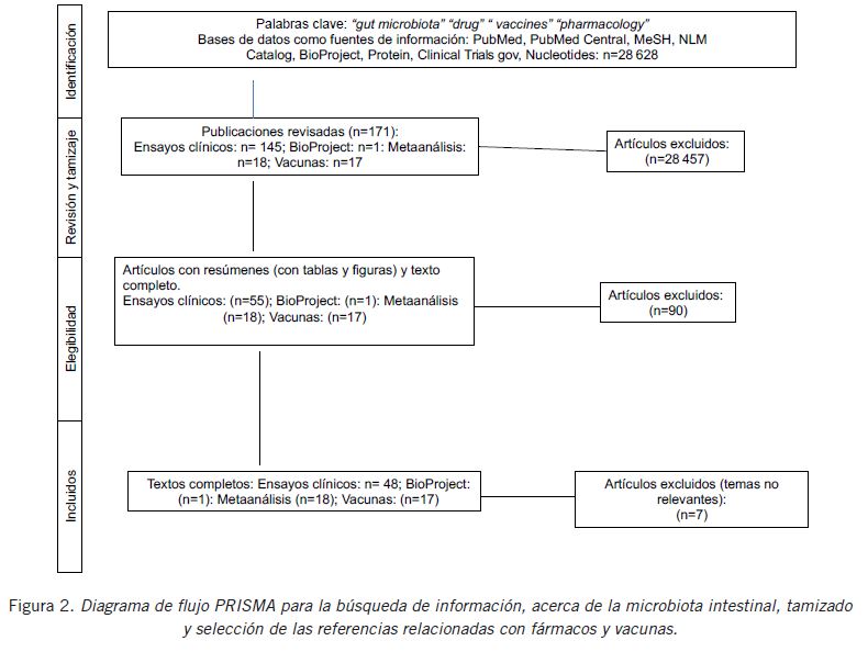 Artículos de revistas, conferencias o capítulos de libros escritos en idioma inglés en el período de 2001 a 2021, procedentes de NCBI-NIH (PubMed, PubMed Central, MeSH, NIH Catalog, BioProject, Protein, ClinicalTrial.gov, Nucleotides, CDD, SWISS-PROT, UniProt, GenBank, Glycans, SWATH Acquisition data bases, ExPASy). Artículos publicados con títulos, resúmenes y texto completo con los términos de búsqueda: gut microbiota, drug, pharmacology, meta-analysis, vaccines y clinical trial.