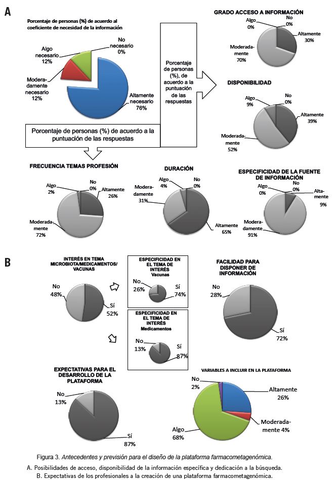 Los resultados del análisis de la encuesta de referencia se muestran en las figuras 3A y 3B, elaboradas a partir de los datos primarios. Se analizaron las variables características: estado de la posibilidad de acceso y disponibilidad de la información acerca de la microbiota intestinal (Fig. 3A), así como las expectativas de los profesionales para disponer de herramientas informáticas rápidas y concretas (Fig. 3B). Los participantes seleccionados formaron parte de un amplio espectro de especialidades, tanto clínicas, como investigativas y educativas, lo cual fue acompañado por una amplia gamade enfermedades de interés profesional, especificadasen las respuestas de la encuesta.