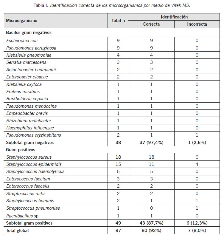 Respecto a IRP, el sistema Vitek-MS identificó correctamente a nivel de especie a 87,7% (43/49) de las bacterias gram positivas y a 97,4% (37/38) de los bacilos gram negativos; los correspondientes valores fueron 92,4% (110/119) y 96,5% (82/85) para el sistema Micro-Flex LT. Ambos equipos identificaron al total de las levaduras (3 Candida albicans por Vitek-MS y 2 Candida parapsilosis por Bruker).