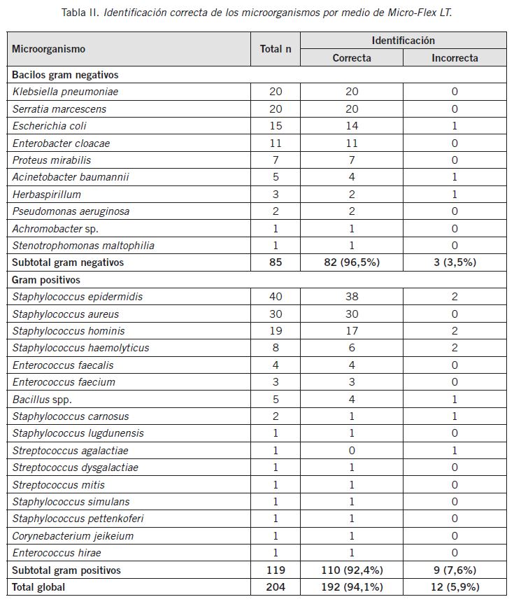 En la Tabla I se muestra el rendimiento de Vitek MS para bacterias gram positivas y para gram negativas y en la Tabla II los correspondientes a Micro-Flex LT. No se identificaron 15 cepas de bacterias gram positivas (6 Sthapylococcus epidermidis, 3 Staphylococcus hominis, 2 Staphylococcus haemolyticus, un Staphylococcus carnosus, un Bacillus sp., un Streptococcus agalactiae y un Streptococcus pneumoniae) ni cuatro de gram negativas (una Escherichia coli, un Acinetobacter baumannii, un Herbaspirillum y una Pseudomonas oryzihabitans).