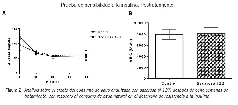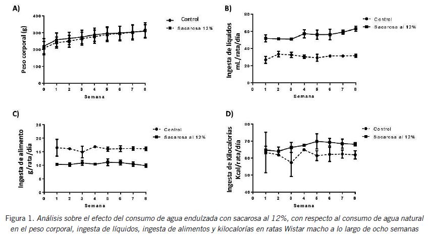 Resumen: La relación entre el consumo de bebidas endulzadas con sacarosa y la reducción en la ingesta de alimentos ha sido objeto de estudio en el ámbito de la salud pública y la nutrición. A medida que el consumo de estas bebidas ha aumentado en las últimas décadas, se ha observado un aumento de los problemas de salud relacionados con la alimentación. En este trabajo se analiza el efecto que tiene la ingesta crónica de agua endulzada con sacarosa sobre el consumo de alimento balanceado, el perfil lipídico, la resistencia a la insulina, y en algunos marcadores del estado nutricional como el peso, la proteína sérica total, albúmina, hemoglobina y creatinina en ratas Wistar macho. El agua endulzada con sacarosa al 12% se administró a un grupo de 9 ratas durante 8 semanas. Un grupo control de 9 ratas bebieron agua natural. El consumo de alimentos entre ambos grupos y los marcadores bioquímicos se analizaron al final del tratamiento. Las concentraciones séricas de glucosa, lípidos, proteínas totales, albúmina, creatinina y hemoglobina se midieron mediante espectroscopia. Los resultados mostraron que el grupo de ratas que consumieron agua endulzada con sacarosa ingirieron menos alimento balanceado; consumieron una mayor cantidad de líquidos y calorías. Sin embargo, el consumo de agua endulzada no modificó el perfil lipídico. Los resultados de marcadores nutricionales tales como peso, creatinina, proteínas totales, albúmina y hemoglobina mostraron que el consumo crónico de sacarosa al 12% no ocasionaba un estado de desnutrición a largo plazo por menor consumo de alimento balanceado.