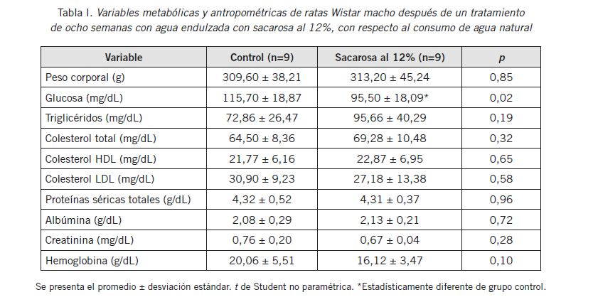 El presente trabajo analiza el efecto que tiene la ingesta de agua endulzada con sacarosa al 12% con respecto al consumo de alimento balanceado, la ingesta total calórica, el perfil lipídico y algunos marcadores nutricionales.