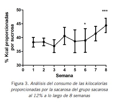 Los datos se registraron como promedio ± error estándar. Las comparaciones entre grupos fueron realizadas con la prueba t de Student. La diferencia fue considerada estadísticamente significativa para un valor de p≤0,05. El software Graph Pad Prism 5.0 (La Joya, CA. EE.UU.) fue utilizado para realizar el análisis estadístico y las gráficas. Se analizó la ingesta de kilocalorías obtenidas del tratamiento con agua endulzada con sacarosa al 12% utilizando la prueba estadística ANOVA de una vía. Posteriormente se realizó la prueba post hoc de Tukey.