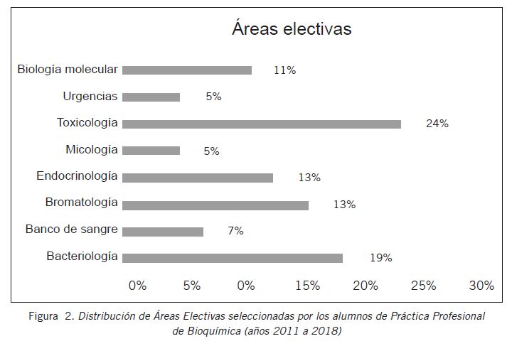 Como forma de analizar la incorporación de Áreas Electivas, en el año 2018 se presentó un informe de esta actividad en las Primeras Jornadas Nacionales de Enseñanza de Farmacia y Bioquímica organizadas por EQUAFyB, donde se evaluó el grado de adhesión de los estudiantes a la innovación instituida entre los años 2011 y 2018 y cuáles fueron las áreas de preferencia. Durante el período en estudio, sobre 103 estudiantes, el 78% (rango: 56-92%) prefería la modalidad que incluyera un Área Electiva. En esa instancia, las áreas más elegidas fueron Toxicología, Bacteriología, Bromatología y Endocrinología (Fig. 2). Estos hallazgos preliminares mostraron un importante grado de adhesión de los futuros bioquímicos hacia otras áreas de formación vinculadas a las incumbencias del profesional, más allá de la Bioquímica Clínica tradicional. Es de señalar que se obtuvo una Mención Especial por la presentación del trabajo en formato póster (8).