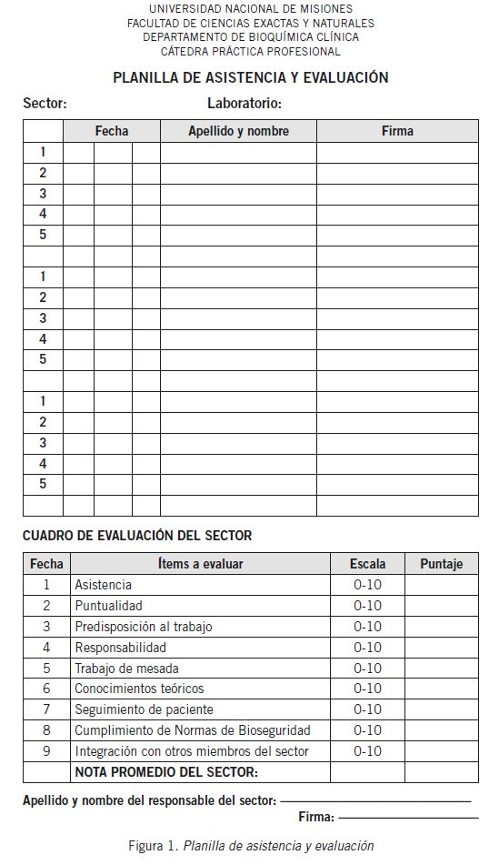Los profesionales tutores de los laboratorios de rotaciones registran las calificaciones en una planilla provista por la cátedra de acuerdo a los puntos de interés para la formación en ese ámbito. Los ítems que se evalúan son: asistencia, puntualidad, predisposición al trabajo, responsabilidad, trabajo de mesada, conocimientos teóricos, seguimiento de pacientes, cumplimiento de normas de bioseguridad e integración con otros miembros del sector (Fig. 1, planilla de asistencia y evaluación).