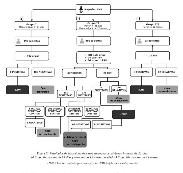 En pacientes mayores de 21 días y hasta el año de vida, en los que se detectó el virus en orina pero no así en la TSN o no se pudo acceder a la misma, no se pudo establecer un diagnóstico de certeza, ya que la infección por CMV podría haberse adquirido de forma congénita o perinatal. La baja sensibilidad de la determinación de CMV en la TSN impide descartar el diagnóstico ante un resultado no detectable.