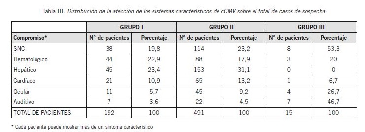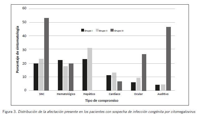 Se analizó en los diferentes grupos el motivo de sospecha de cCMV (Tabla III). Dentro del Grupo I, los pacientes presentaban principalmente compromiso hematológico y hepático; en el Grupo II, el compromiso principalmente fue hepático y del SNC, mientras que en el Grupo III, la clínica mostraba un compromiso variable entre lo hematológico, hepático, ocular, auditivo, cardíaco y del SNC (Fig. 3).