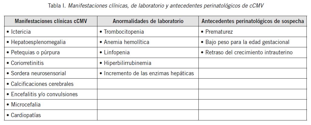 Como los síntomas de la cCMV suelen ser inespecíficos (Tabla I), se los ha asociado también a malformaciones congénitas neurológicas, gastrointestinales y musculoesqueléticas (12). Los niños pueden presentar compromiso hematológico y/o hepático de forma frecuente que orientan hacia la sospecha de la enfermedad, aunque se comparten con otras enfermedades (13). La presencia de antecedentes como prematurez, retraso en el crecimiento intrauterino o bajo peso al nacer son también motivos de sospecha clínica de cCMV (Tabla I) (13) (14).