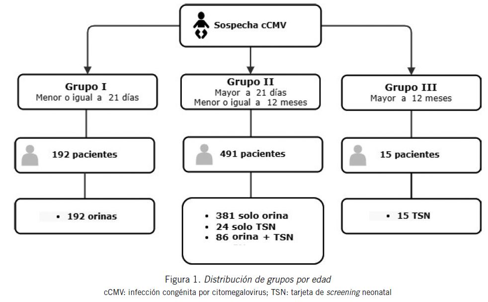 Se analizaron las muestras de 698 pacientes con sospecha de cCMV desde el 1 de enero de 2016 al 31 de diciembre de 2022 que correspondían a 125 muestras de TSN y 659 muestras de orina. Se definieron tres grupos de análisis según la edad del paciente y la estrategia diagnóstica utilizada: el Grupo I integrado por neonatos de hasta 21 días inclusive, el Grupo II compuesto por pacientes entre 22 días y 12 meses de vida y el Grupo III formado por niños mayores de 12 meses y hasta 4 años. De los pacientes del Grupo I se remitieron solo muestras de orina al laboratorio, de los pacientes del Grupo II se remitieron orina, TSN o ambos tipos de muestras y de los pacientes del Grupo III, únicamente TSN (Fig. 1).