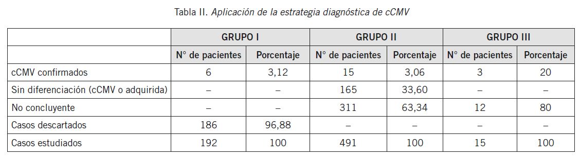 Se estudiaron 698 pacientes con sospecha de cCMV de los cuales 192 (27,51%) pertenecieron al Grupo I, 491 (70,34%) al Grupo II y 15 (2,15%) al Grupo III. Del total de casos estudiados se arribó a un diagnóstico confirmatorio de cCMV en 24 casos (3,44%) y en 165 casos no se pudo diferenciar entre cCMV o adquirida (Tabla II).