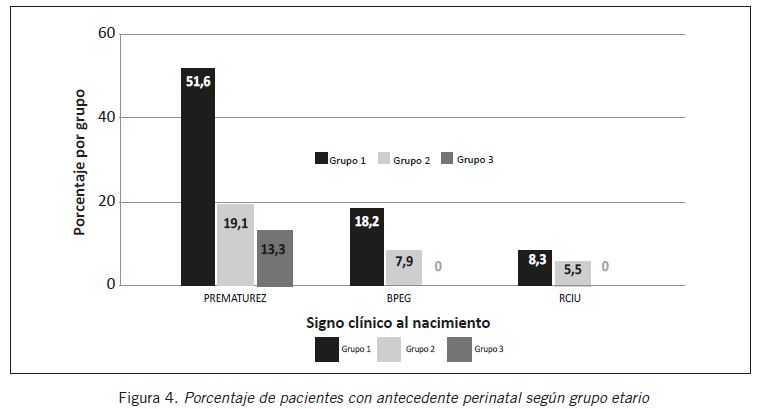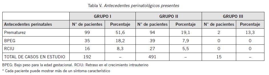 Se realizó un análisis clínico similar teniendo en cuenta los antecedentes perinatales relevantes (Tabla V) (Fig. 4). La prematurez y el BPEG fueron elevados en el Grupo I con respecto a los demás grupos.