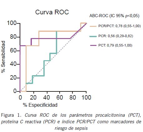 El mejor valor de corte de la PCT para predecir riesgo de sepsis fue PCT>0,88 ng/mL, que fue mayor que el publicado en la bibliografía.
