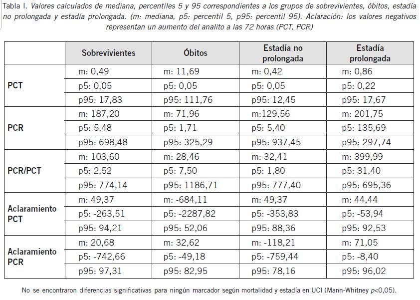 La PCR y el aclaramiento de la PCR no parecen ser marcadores de mortalidad. Al evaluar dichos marcadores en función de los días de internación, PCR/PCT parece ser el mejor marcador de estadía prolongada en UCI. Esto no pudo ser demostrado estadísticamente en este estudio (Mann-Whitney p>0,05).