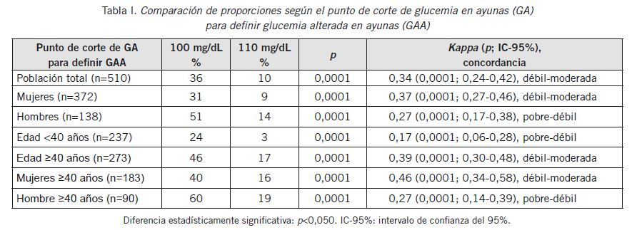 Se incluyeron 510 individuos (mujeres: 73%) de un total de 557 (mediana de edad: 41 años; rango: 18-79 años). Se observó una diferencia estadísticamente significativa en la proporción de individuos clasificados con GAA (100 mg/dL vs. 110 mg/dL); en la población total: 36% vs. 10%, en mujeres: 31% vs. 9%, en hombres: 51% vs. 14%, en <40 años: 24% vs. 3%, en ≥40 años: 46% vs. 17%, en mujeres ≥40 años: 40% vs. 16%, en hombres ≥40 años: 60% vs. 19%. La concordancia de ambos valores para clasificar individuos con GAA fue de débil a moderada para la población total, para mujeres, para personas ≥40 años, y para mujeres ≥40 años; y de pobre a débil para hombres, para personas < 40 años, y para hombres ≥40 años. Estos resultados se observan en la Tabla I.