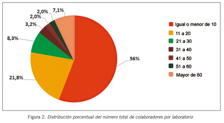 En relación a la participación del recurso humano, se puede observar que el 56% de los laboratorios encuestados contaban con menos de 10 colaboradores (personal de laboratorio, administrativo y de intendencia), mientras que los laboratorios con más de 60 colaboradores correspondían al 7% de los participantes (Fig. 2).