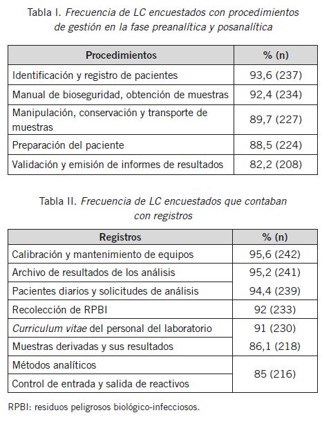 Por otra parte, la información obtenida respecto a la documentación, permitió identificar que el 80% de los LC contaban con procedimientos requeridos en la fase preanalítica y en la fase posanalítica, mientras que más del 85% de ellos tenía registros de gestión de la calidad (Tabla I) (Tabla II).