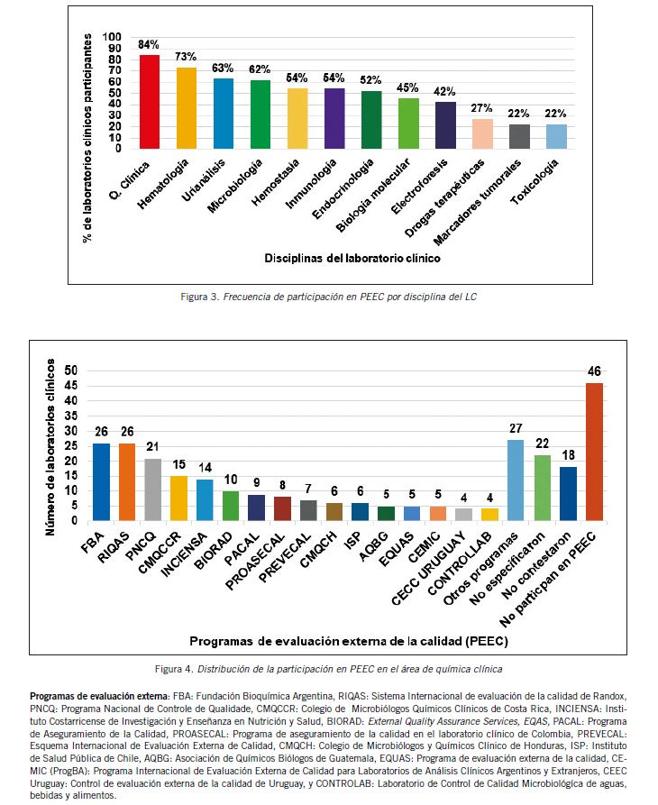 De la participación de los LC encuestados en la Evaluación Externa de Calidad (EEC) en la disciplina de química clínica, se observó que 26 laboratorios de la Argentina participaban en el PEEC-FBA; mientras que, de los 18 LC que se evaluaron en el PNCQ, 13 eran de Brasil, 3 de Ecuador, 1 de Bolivia y 1 de Uruguay. Respecto de los programas internacionales, se destaca la participación de los encuestados en el PEEC de Randox Laboratories (RANDOX) conocido como RIQAS –acreditado por ISO 17043 con 26 LC procedentes de Costa Rica, Bolivia, México, Colombia, Argentina y Perú.