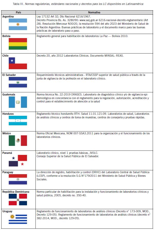 Existe una diversidad en la regulación local que se aplica en los laboratorios clínicos en los diferentes países de Latinoamérica, de los cuales algunos no están sujetos al cumplimiento de normas o reglamentos equivalentes, como los listados en la Tabla III.