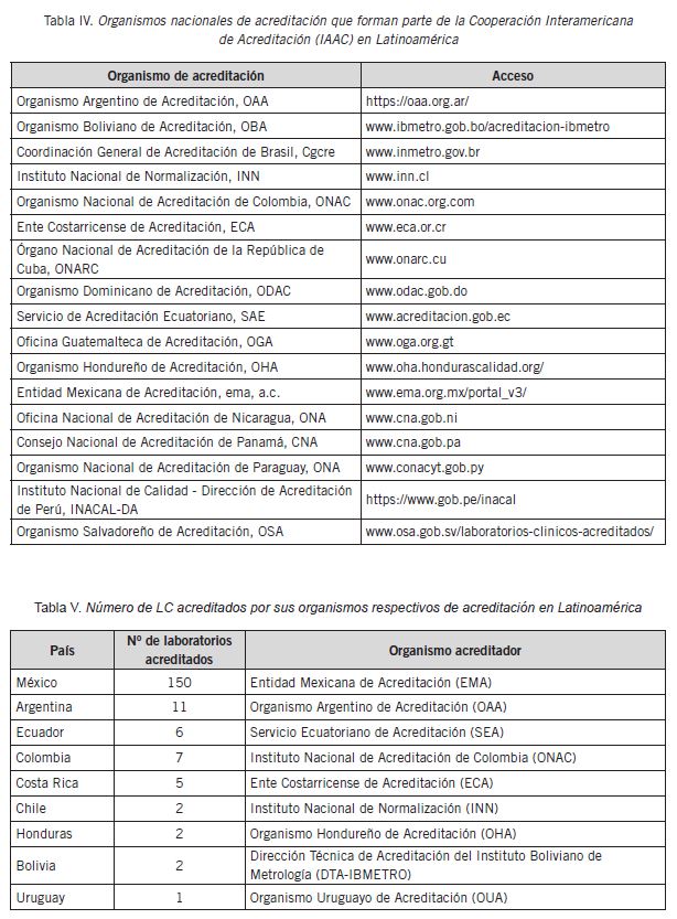 En relación a la presencia de organismos facultados para acreditar por la norma ISO 15189 en Latinoamérica, se presenta el listado en la Tabla IV. En la Tabla V se mencionan los laboratorios acreditados en el momento del presente trabajo de investigación, entre los que sobresale el número de laboratorios acreditados en México por este estándar internacional.