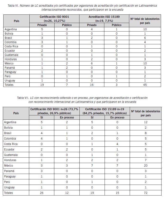 De los laboratorios participantes en la encuesta (n=253), 17,79% (n=45) estaban acreditados y/o certificados por normas internacionales (ISO 15189 y/o ISO 9001). De éstos, 7,51% (n=19) estaban acreditados por la norma ISO 15189 y 10,27% (n=26) certificados por la norma ISO 9001 por sus respectivos organismos nacionales de acreditación (ONA) (Tabla VI).