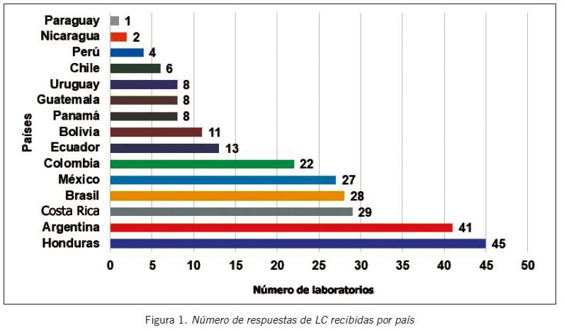Se contó con la participación de 15 de los 16 países integrantes de COLABIOCLI (93,75%), con una mayor participación de laboratorios de Honduras 17,79% (n=45), Argentina 16,21% (n=41), Costa Rica 11,46% (n=29), Brasil 11,07% (n=28) y México 10,67% (n=27) (Fig. 1).